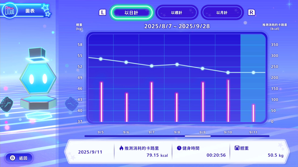 將推測消耗卡路里、健身時間和體重