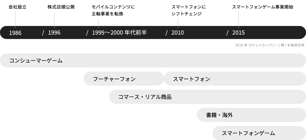 加えて、経験から新しいビジネスチャンスを逃さないために、自分達が変わることをためらわない「変化力」を持ち合わせています。現在も変化の激しいIT業界において二つの力を活用することで、主力事業を変えながらも継続的に収益を生み出しています。