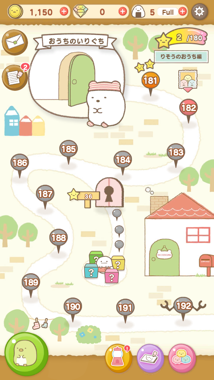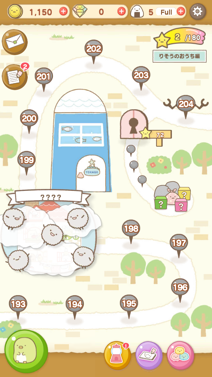 新マップでは、これまでになかったびっくり箱、大きな岩などの新しいギミックの登場に加えて、 ガチャでゲットできる新しいもちものもたっぷり追加! すみっコたちのまんぞく度も上がって、高得点が狙えます。