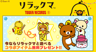 スマートフォンゲーム「あつめて!リラックマ」では、 7月28日より開催される「リラックマ×TOWER RECORDSキャンペーン 2016」にあわせて、 TOWER RECORDSコラボデザインのアイテムの配信が決定!