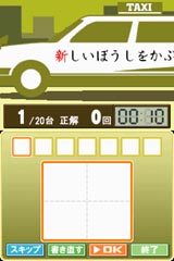 画面上を往復するタクシーの側面に書かれている赤い文字を、読みがな、もしくは漢字に直し、下画面にすばやく書き込んでいきます。正解するとタクシーを止めることができます。