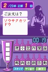 客の注文の中に赤いカタカナで四字熟語が入っています。その四字熟語に相当する正しい漢字をビンのラベルの中から選んで順番にタッチし、飲み物を完成させます。