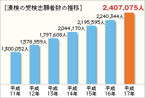 平成17年度の受検志願者数は240万人を超え、今や日本最大級の検定試験であり、受検者の年齢層は4歳から94歳までと他の検定に比べて大変幅広く、特に近年では生涯学習の一環として大きな注目を浴びています。